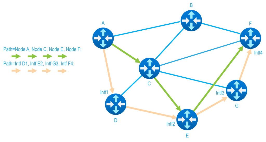 At the other end of the spectrum, paths can be computed using abstract constraints instead of fixed waypoints. Rather than naming specific nodes, the operator defines characteristics the path must satisfy—such as performance attributes, risk separation, or administrative policies.