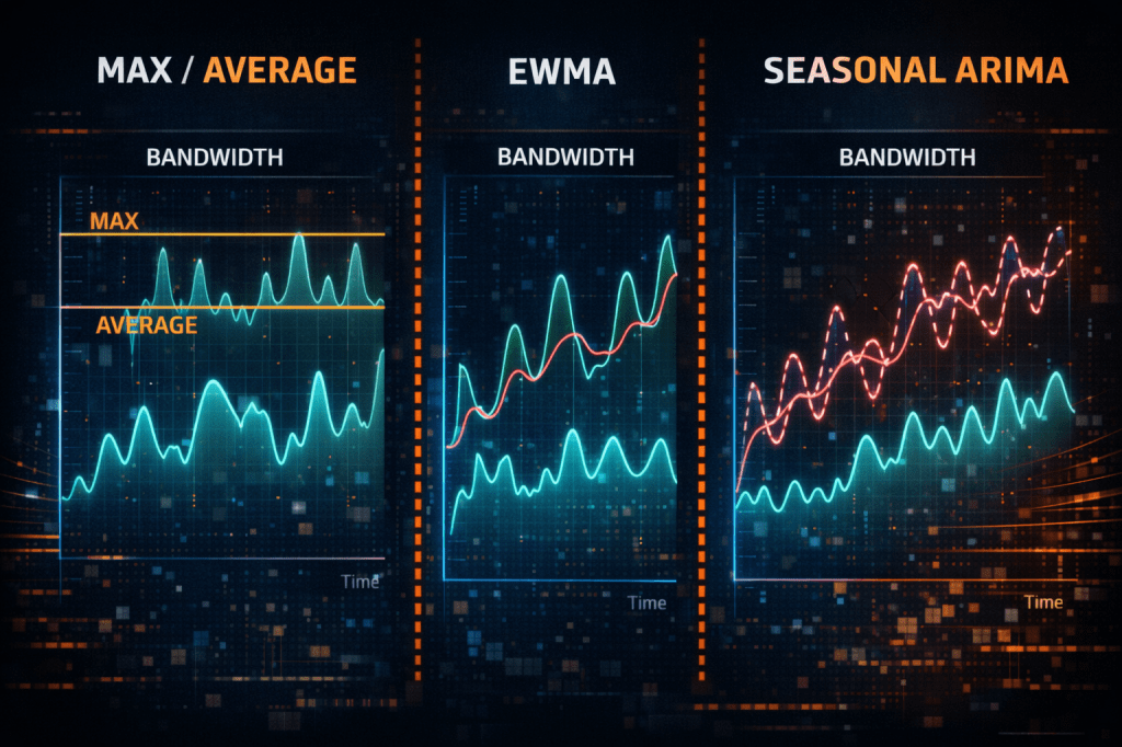 More advanced systems incorporate predictive modeling. Forecasting methods such as seasonal ARIMA or Holt-Winters analysis attempt to capture diurnal cycles, weekly patterns, and long-term growth trends. Such machine learning approaches may incorporate additional variables to refine predictions further. These predictive models may improve bandwidth efficiency by predicting future BW adjustment needs if sufficient trends and patterns are present in the observed data. The cost of this sophistication lies in the need for historical data storage, model training, and increased computational requirements. As a result, predictive estimation is often performed in centralized analytics systems rather than directly on routers.