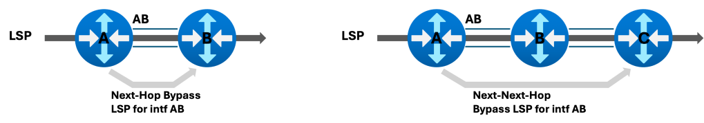 Facility backup simplifies this behavior by redirecting all affected LSPs into a shared bypass tunnel. The switchover is straightforward and efficient, but it may temporarily concentrate traffic along a single alternate path, regardless of the individual characteristics of each LSP.